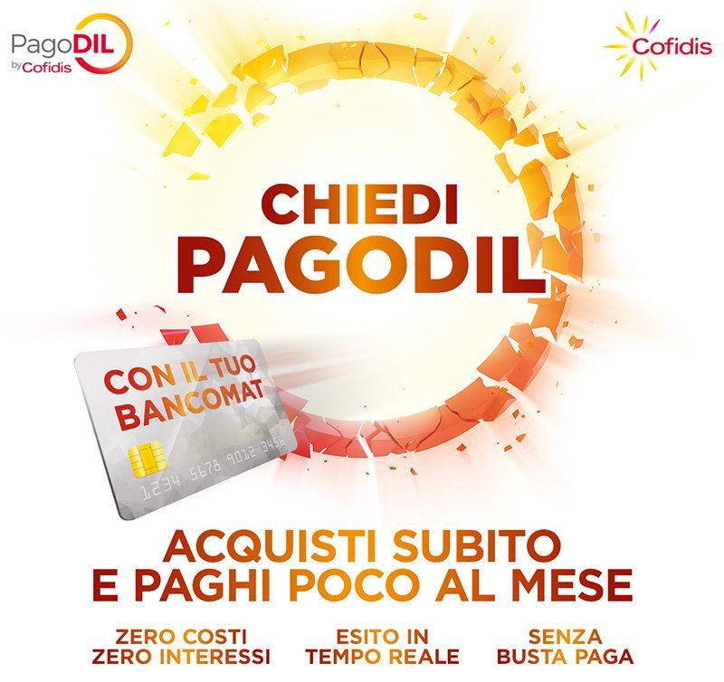 PagoDIL by Cofidis: acquista subito e suddividi l'importo in comode rate mensili, senza interessi né costi aggiuntivi. L'addebito avviene direttamente sul tuo conto corrente, con esito immediato e senza necessità di presentare documenti di reddito.